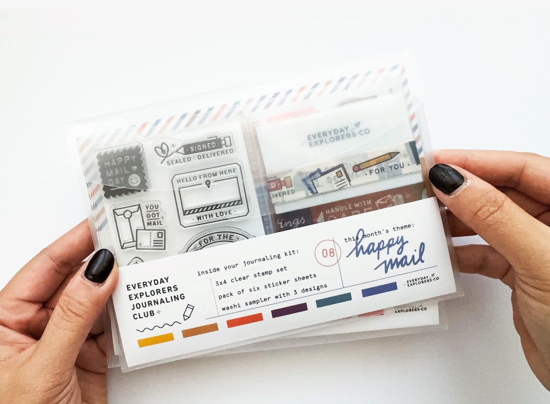 We listened to feedback! The new kit focuses on premium materials and fewer items per kit that you're sure to use each month. Instead of 4x6 stamps and notebooks, you get perfectly sized 3x4 stamps and specialty stickers (PET, washi paper) that weren't available before. You get three designs of washi tape, too!